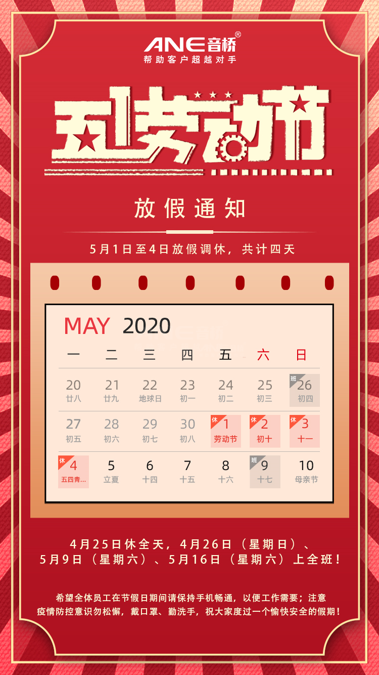 感謝大家對ANE音橋電子的支持,順應國家法定假期的規定,我們將在5月1日至5月4日(星期五至星期一)放假,特此通知。