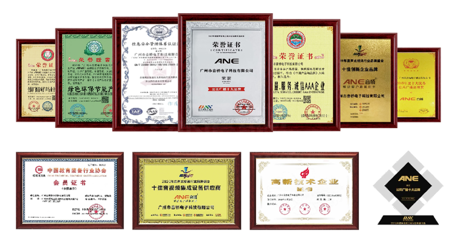 ANE音橋,中國音視頻產品第一梯隊廠商,2006年創立至今17載,在教育、司法、醫療、安防、酒店、金融等領域,成功案例累積960000+,并擁有130+項相關專業領域專利,60+項使用新型專利,中國音視頻行業協會、中國質量檢驗協會授予的多項資格證書。